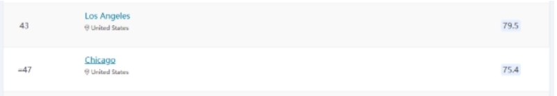 美國在本次排名中,有 5 個城市進(jìn)入 TOP50。