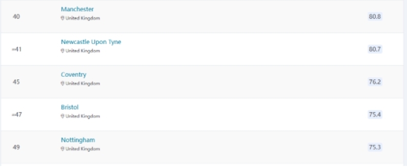 其他上榜城市亦各有優(yōu)勢:格拉斯哥(第 35 名)以歷史悠久的格拉斯哥大學(xué)為核心,其醫(yī)學(xué)、工程等專業(yè)表現(xiàn)突出;曼徹斯特(第 40 名)、紐卡斯?fàn)枺ǖ?41 名)、考文垂(第 45 名)、布里斯托(第 47 名)及諾丁漢(第 49 名),均擁有多所優(yōu)秀高校,并在藝術(shù)、科技、商業(yè)等領(lǐng)域形成了獨(dú)特發(fā)展優(yōu)勢。