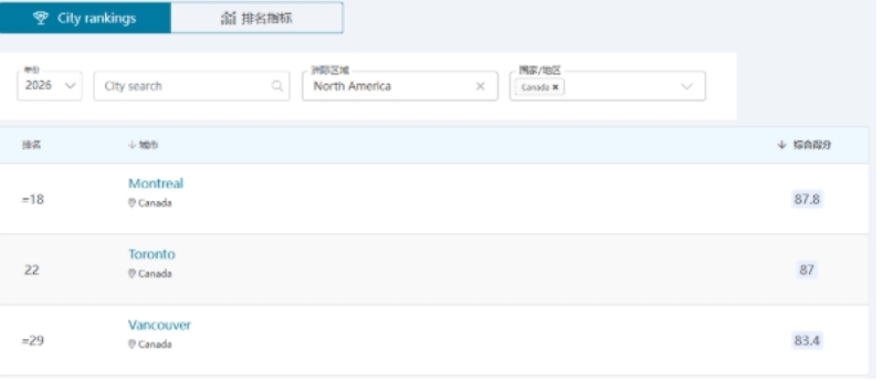 本次排名中,加拿大共有 3 座城市躋身全球 TOP50,展現(xiàn)出優(yōu)質(zhì)的留學(xué)資源與環(huán)境。